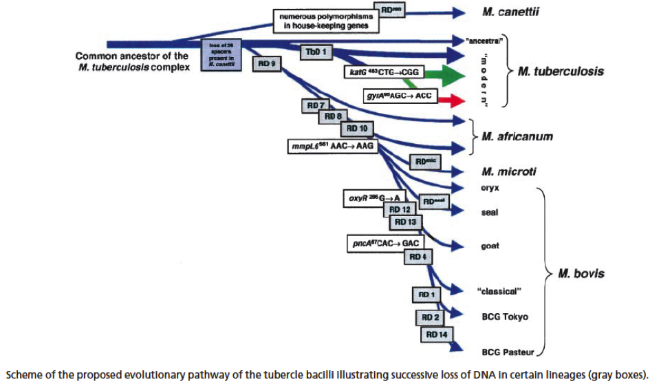 The evolution of tuberculosis-causing mycobacteria started from a common ancestor of M. tuberculosis and M. canettii. During recent evolution, M. tuberculosis has lost the ability to produce lipo-oligosaccharides and for inter-strain transfer of DNA. It has a clonal population structure. Genetic deletion analyses established the first evolutionary scheme of tuberculosis-causing Mycobacteria (Brosch PNAS 2002)[2].